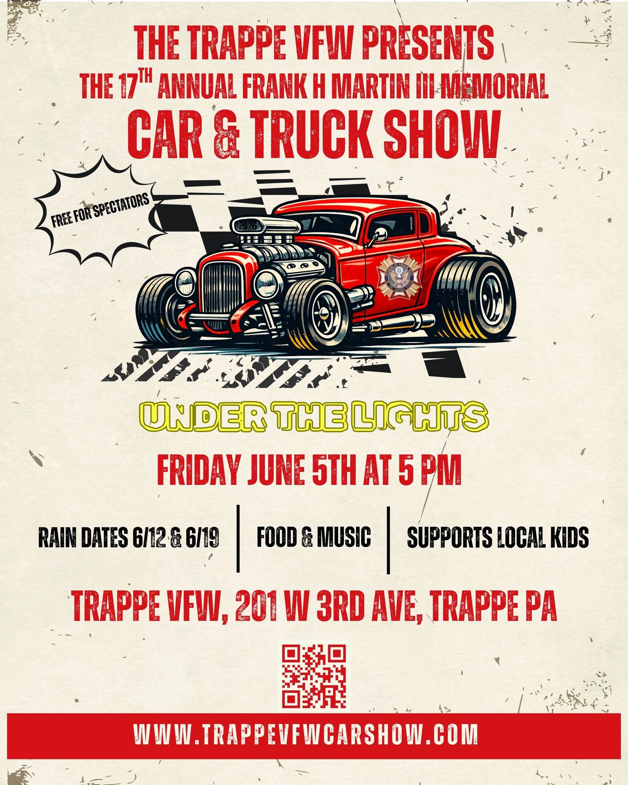Starting in 2008, the Trappe VFW and their car show committee put on an annual car & truck show to raise money for a local child in need. In 2010, after one of the shows founding members passed away, the show was named in honor of him, Frank H. Martin III. Today the Frank H. Martin III Memorial Car & Truck Show continues to help local c